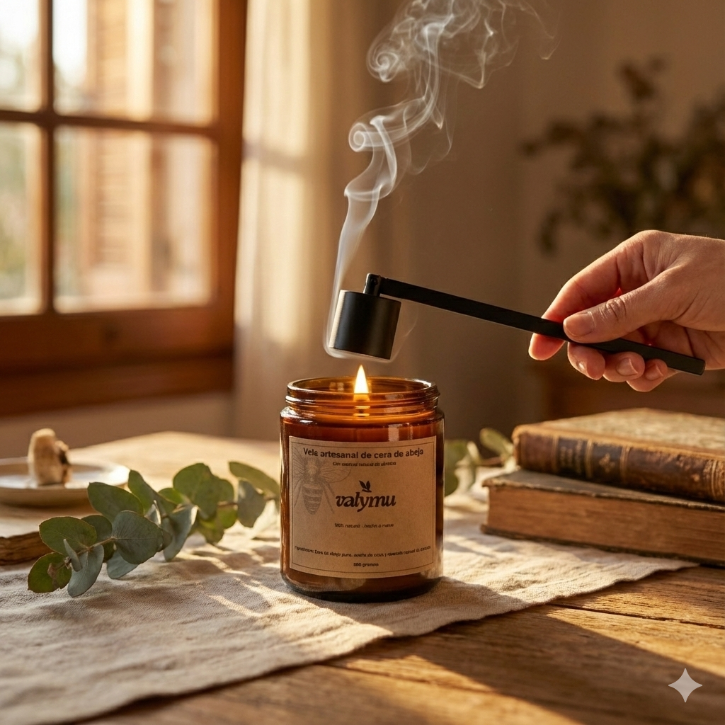 Soplar una vela puede hacer que la cera caliente salpique, genera humo negro desagradable y puede dañar la mecha. El apagavelas ahoga la llama suavemente, evitando todos estos problemas.