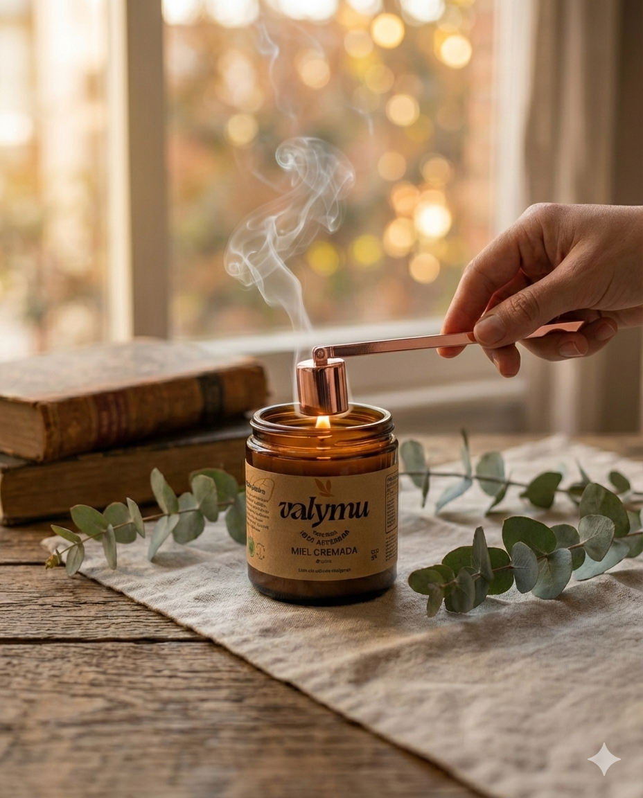 Soplar una vela puede hacer que la cera caliente salpique, genera humo negro desagradable y puede dañar la mecha. El apagavelas ahoga la llama suavemente, evitando todos estos problemas.
